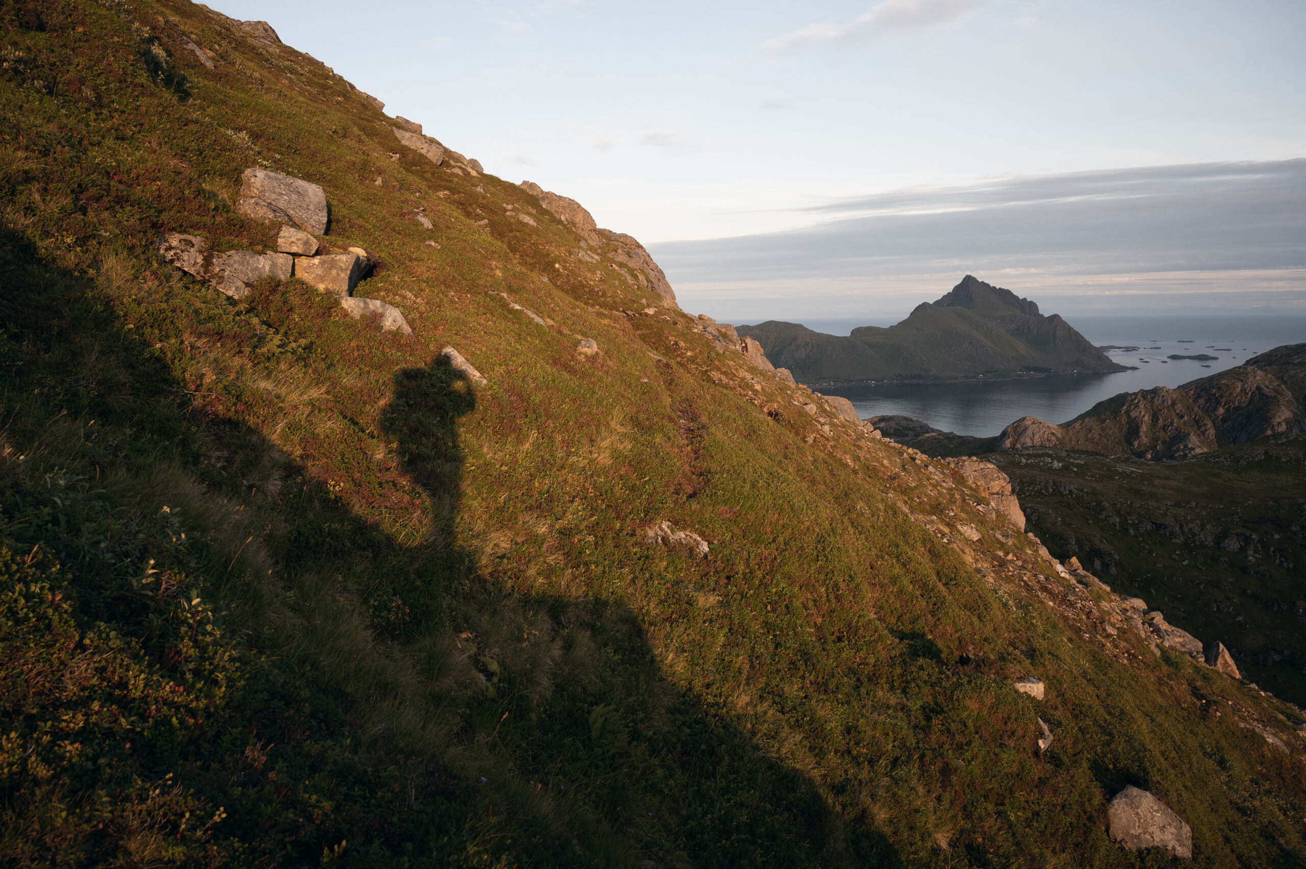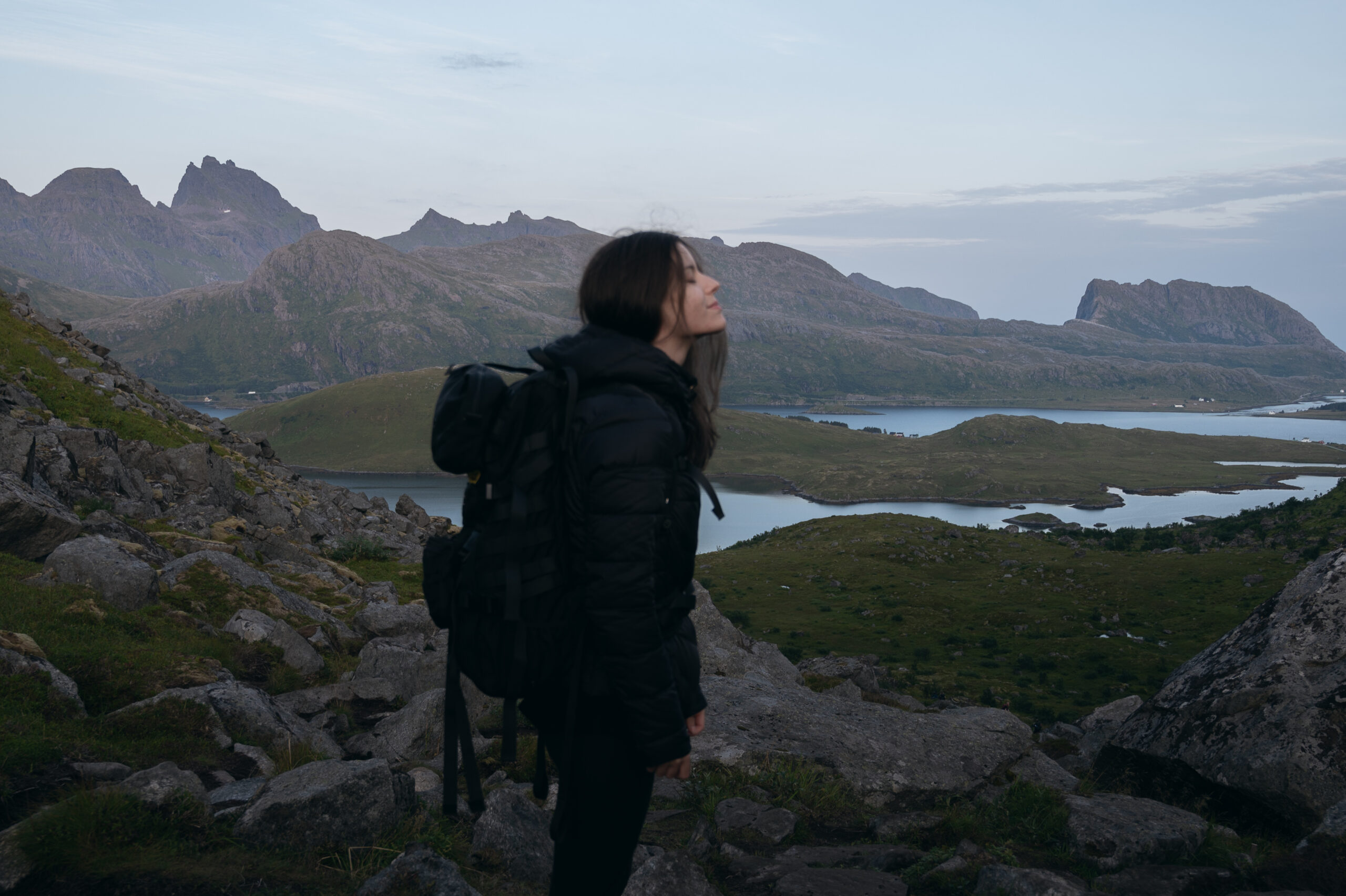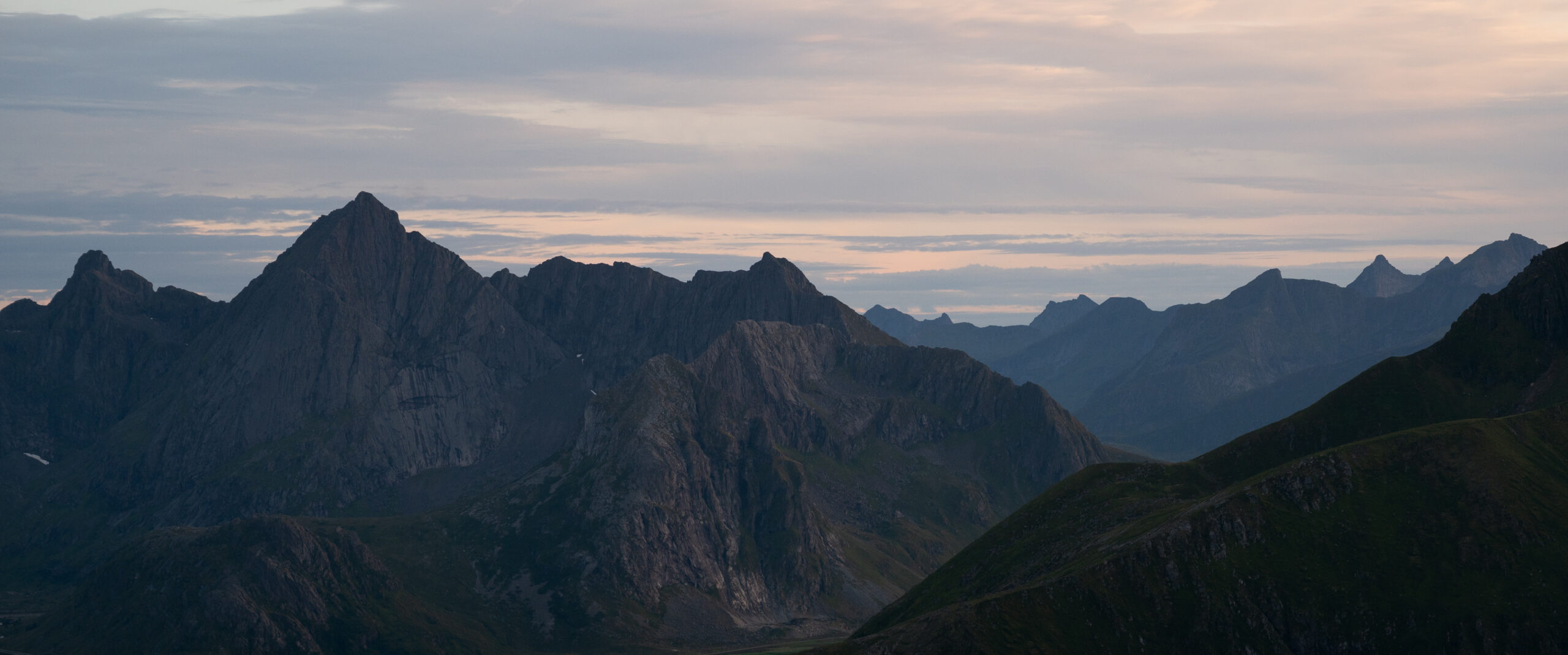 The hike was longer than expected, and in a matter of minutes we suddenly were trapped by the long mountain shadows brought by the setting sun behind them. It was still a slow sunset, as the midnight sun had just ended a couple of weeks earlier. The blue hour covered the whole set, and the wind started to catch up, holding us back from completing the hike. Even so, we managed to observe the mountain ranges that surrounded us.