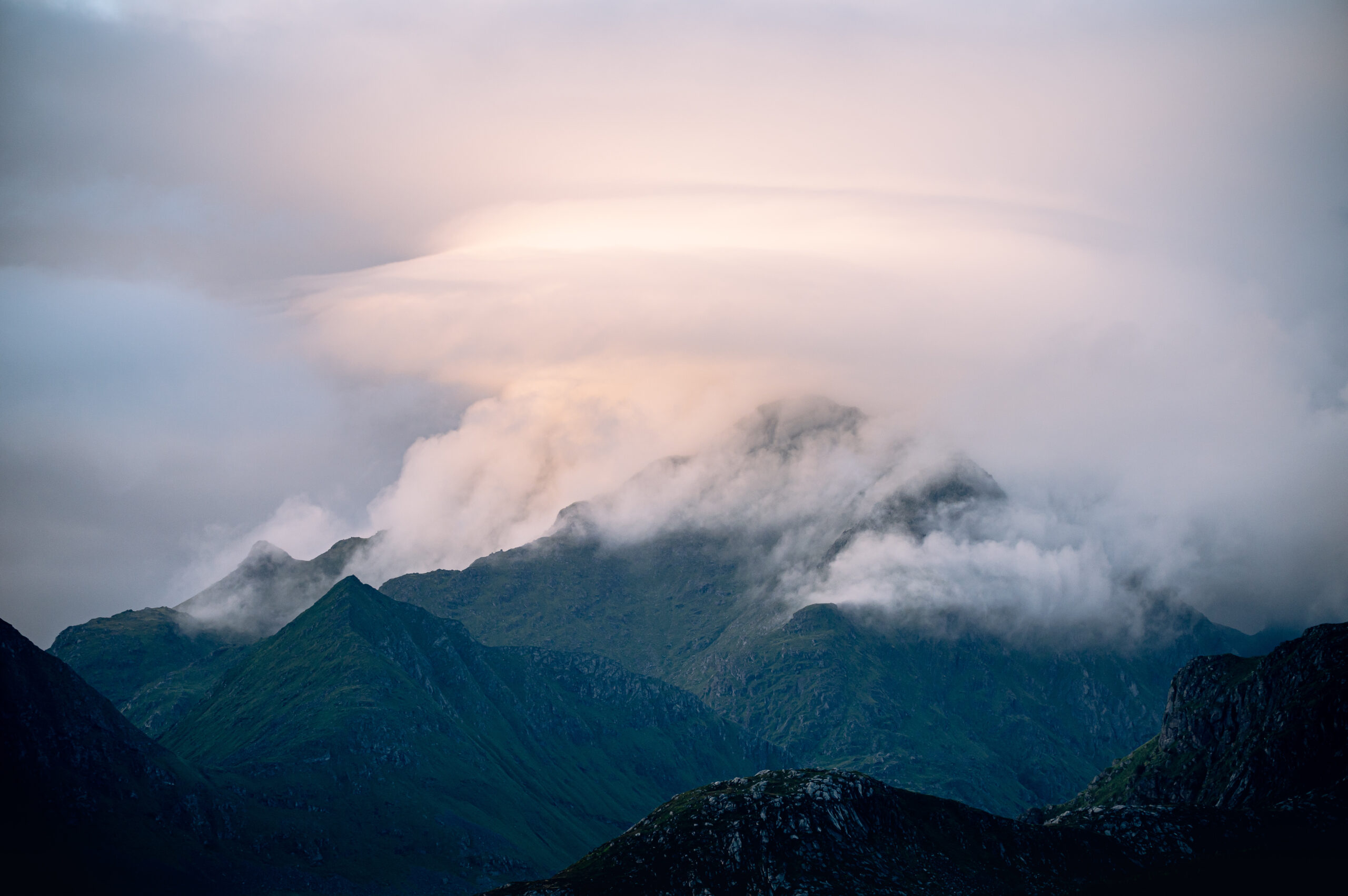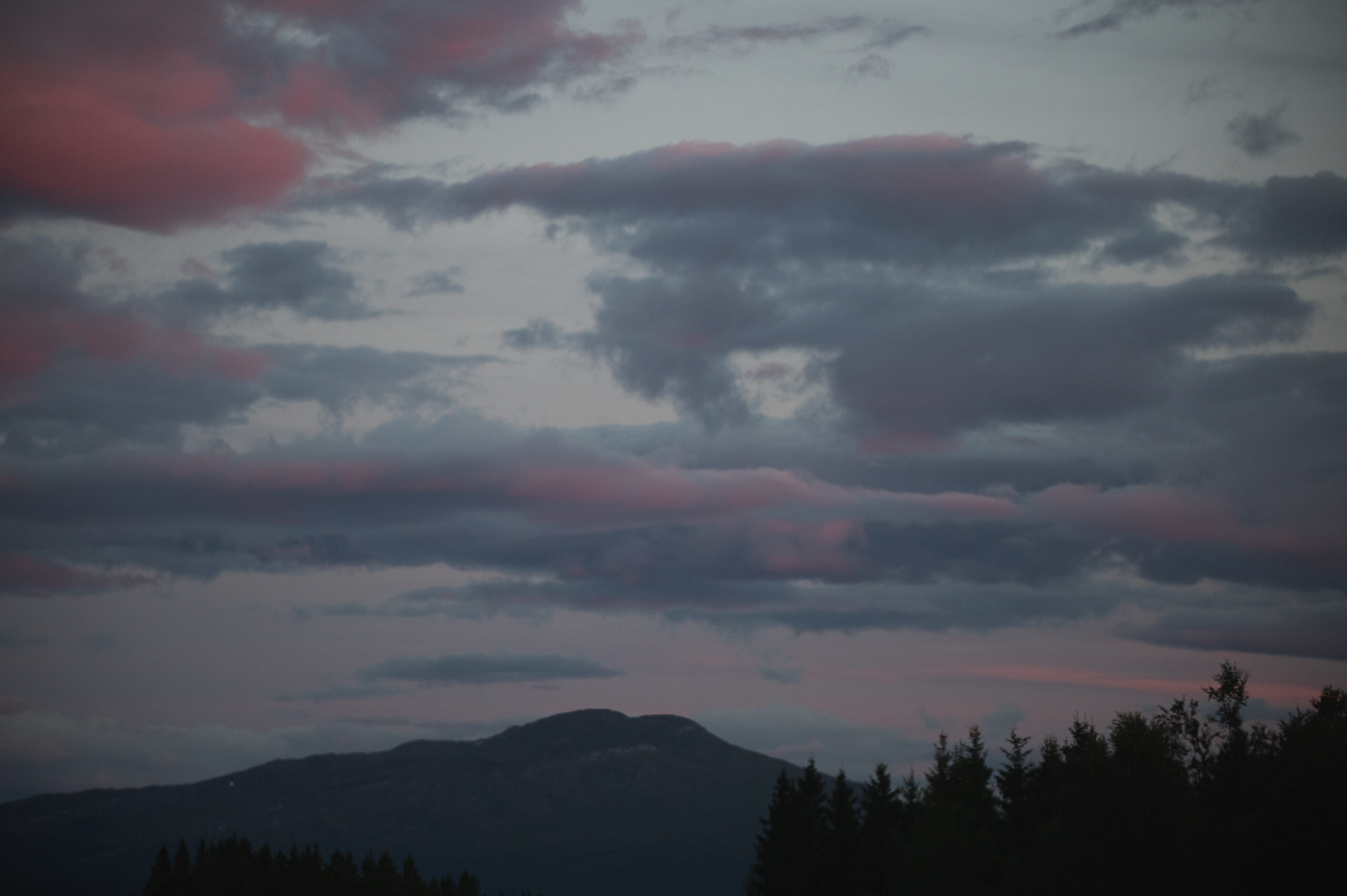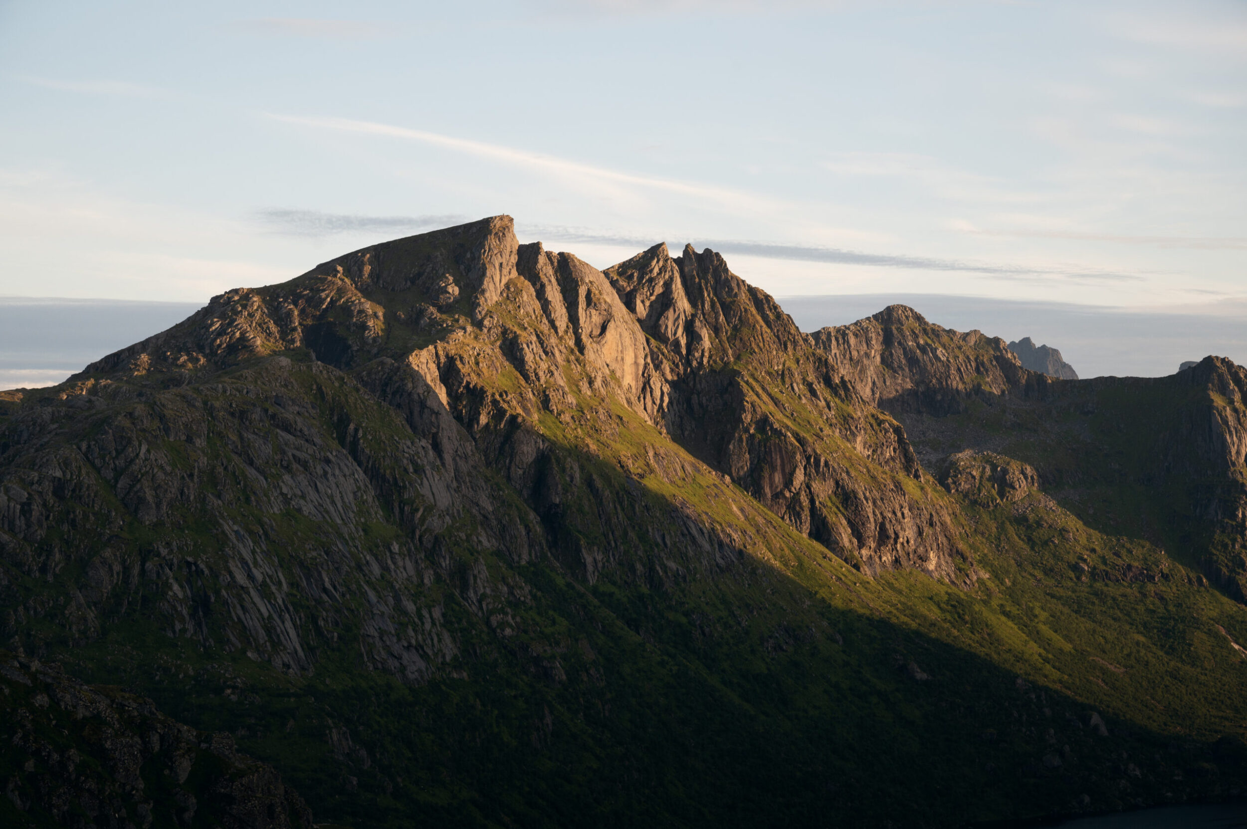 The hike was longer than expected, and in a matter of minutes we suddenly were trapped by the long mountain shadows brought by the setting sun behind them. It was still a slow sunset, as the midnight sun had just ended a couple of weeks earlier. The blue hour covered the whole set, and the wind started to catch up, holding us back from completing the hike. Even so, we managed to observe the mountain ranges that surrounded us.