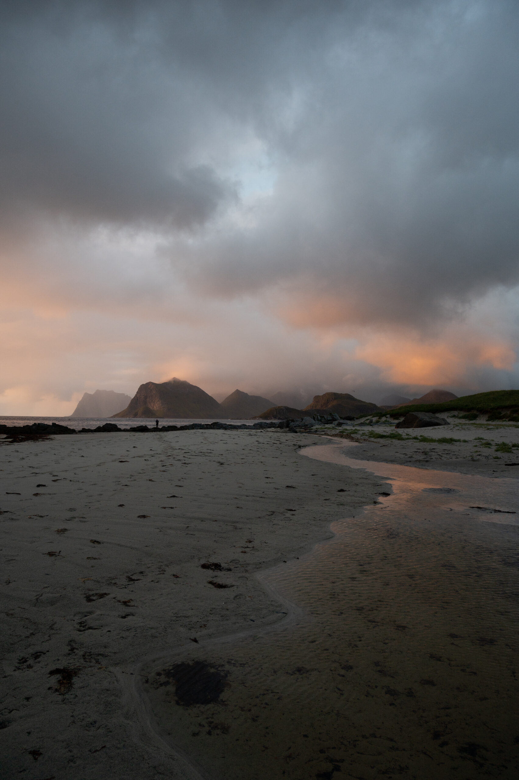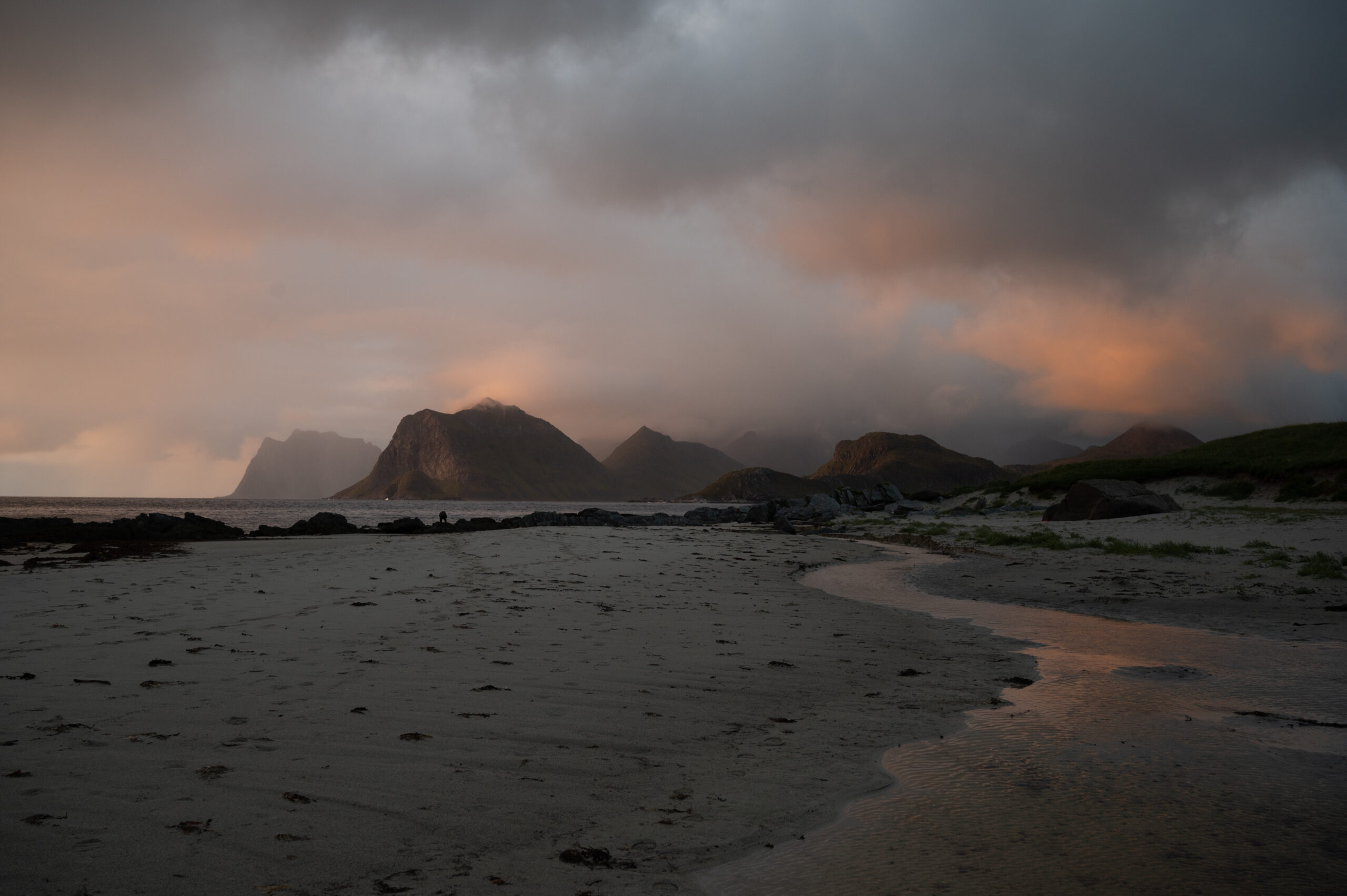 If I have to chose one moment from the whole trip, it would be this one: we had been waiting to go to this specific spot to spend the night. We were looking forward to it as it is a bit away from the crowd in Lofoten, and it is the perfect spot for those late evening, early morning mountain views from inside the camper van. The weather that day had been quite random, ending with a partially covered sky during sunset, brightening up the whole landscape at the beach. The scenery reminded me of a painting, and quite rarely a picture makes justice of the real version of the place. It was windy, the waves were crashing on the shore, and the seagulls were hunting, but I could only feel peace standing on the beach, admiring the slowly shape-changing clouds, and the sun steadily hiding behind the horizon.